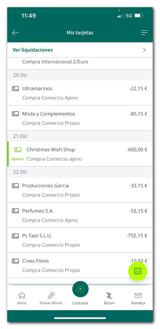 ¡¡Muy fácil!! Tras realizar la compra tendrás que aplazar el abono de la misma. Para realizar el aplazamiento tienes que acceder a los movimientos desde tu Ruralvía y seleccionar la compra que te interesa aplazar.