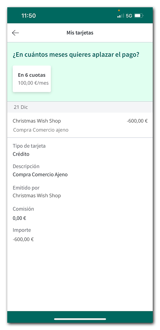 Una vez seleccionada la compra a aplazar tenemos que seleccionar los meses que deseamos aplazar el pago, seleccionando en este caso el aplazamiento a 6 meses.
