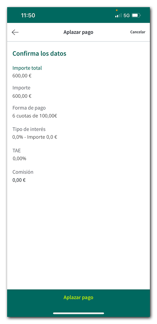 Por último, solo tienes que confirmar el aplazamiento haciendo click en "Aplazar pago":